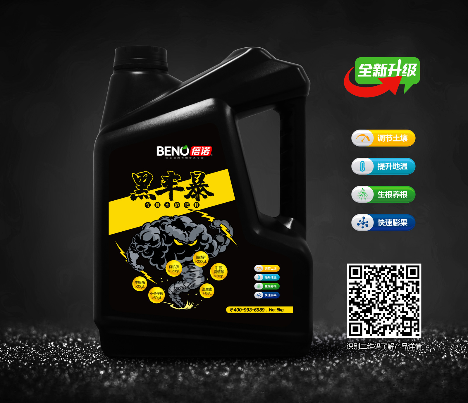 倍诺-黑丰暴;本品是含腐植酸有机水溶肥料,以矿源腐植酸为载体,添加高含量的氮磷钾、有机质、生根酶、小分子碳、维生素等营养成份螯合而成。使用本品能生根养根、刺激生长、快速膨果、调节酸碱、改良土壤、增加肥效、增强抗逆、提升地温、防病抗冻,显著提高作物的品质和产量,大幅度增加经济效益和生态效益。长期使用可以改善土壤环境,刺激作物生长,提高抗逆性改善作物品质,提高作物产量。