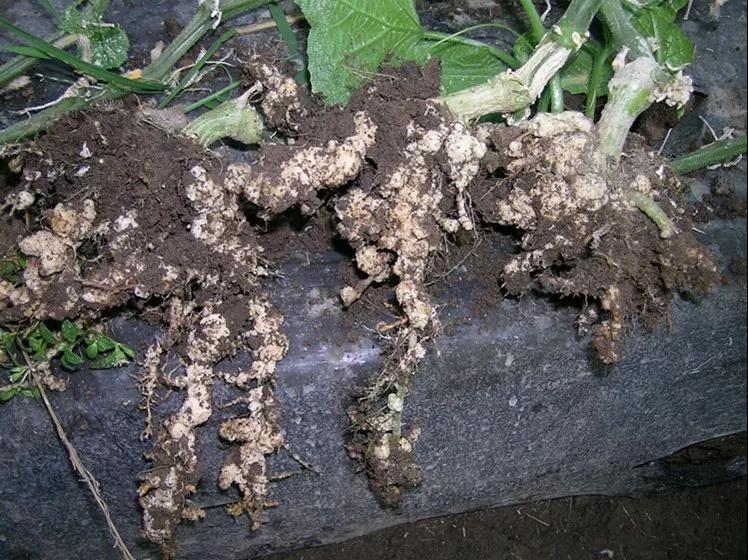 4.根结线虫。黄瓜根结线虫病症状主要表现在根部,轻病株症状不明显,重病株则较矮小,发育不良,结实不好,在干旱条件下中午萎蔫。将病瓜秧拔起,会发现侧根或须根上产生大小不等的瘤状根结。有的呈现串珠状发生,使根系变粗,解剖根结,会发现病部组织内有很小的乳白色线虫。