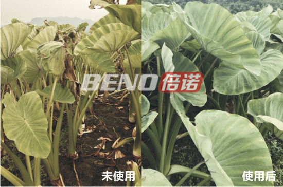 未使用的香芋,叶片整体颜色发黄,形状卷枯,枝叶稀疏,甚至烂叶情况严重,而且得软腐病的几率比较高,这样的香芋产量较低,严重的得软腐病后导致香芋块茎腐烂、植株死亡。使用过倍诺产品的香芋,在第一次喷施过三四天后,就发生了明显的变化,从根部向上看,根茎粗壮,枝条多发,叶片肥厚而舒展,颜色深绿,看上去生机勃勃的样子,这样的香芋更利于进行光合作用,促进香芋生长,和未使用的香芋有明显的差异。