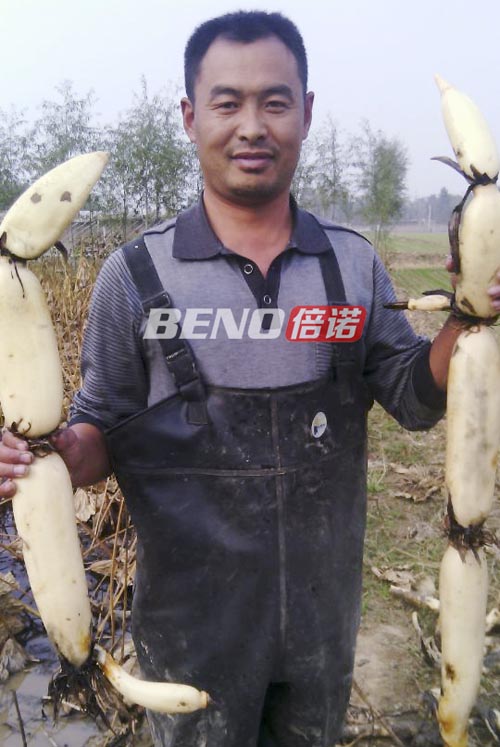 大家好,我是山东省茌平县的白道峰,这是我种植的藕,我用的是倍诺广谱型的冲施肥,用上之后根茎明显粗壮了、叶片幽绿肥大肥厚,长势非常好,并且不容易生病,我同村的几个朋友种植的藕都没有我的藕长势好,经我给他们推荐了倍诺广谱型的冲施肥后,他们用了之后藕的长势明显比之前好了很多,现在大家都非常认可倍诺的产品。